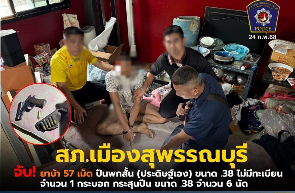 งานสืบสวน จับกุมหนุ่มวัย 27 ปี ตรวจค้นพบปืนพกสั้น (ประดิษฐ์เอง) ชนิดหักลำ ขนาด .38
