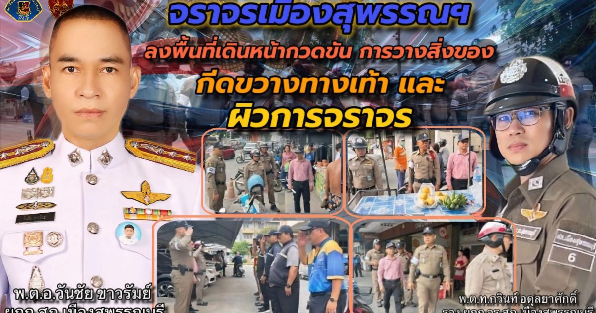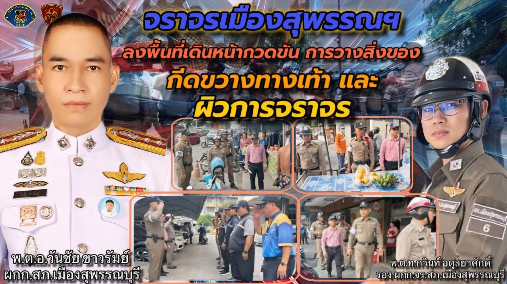 จราจรเมืองสุพรรณฯ ลงพื้นที่เดินหน้ากวดขัน การวางสิ่งของกีดขวางทางเท้า และ ผิวการจราจร