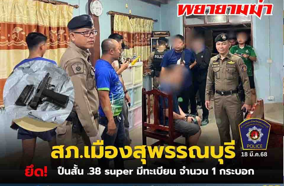 จับอาวุธปืน อ.เมืองสุพรรณบุรี 24 มีนาคม 2568 โดย adm_suphan adm_suphan / ข่าวประชาสัมพันธ์,ข่าวกิจกรรมหัวหน้าสถานีตำรวจในการเสริมสร้างคุณธรรมและความโปร่งใส,ข่าวประชาสัมพันธ์,ข่าวภารกิจผู้บังคับบัญชา,ไม่มี วัน ที่18 มีนาคม 2568ชุดสืบสวน พร้องานป้องกันปราบปราม สภ.เมืองสุพรรณบุรี จับกุมชายวัย 53 ปี ผู้ต้องหาพยายามฆ่า โดยอาวุธปืน ตรวจค้นยึดปืน colt .38 super 1 กระบอกบริเวณ ม.2 ต.ดอนตาล อ.เมืองสุพรรณบุรี จว.สุพรรณบุรี