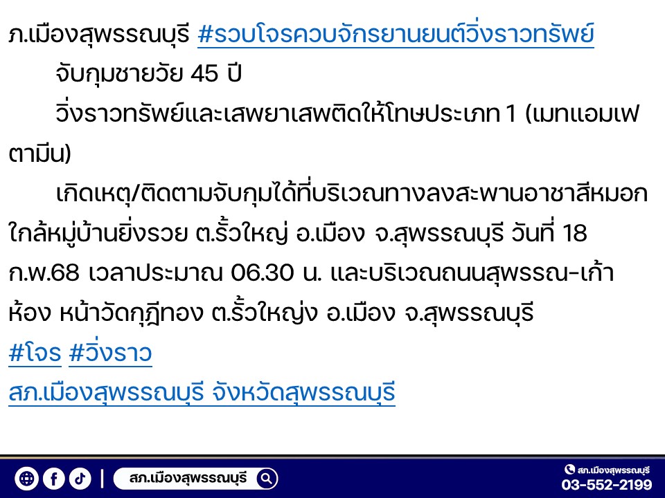 จับโจร วิ่งราวทรัพย์ สภ.เมืองสุพรรณบุรี 18 กุมภาพันธ์ 2568 โดย adm_suphan adm_suphan / ข่าวภารกิจผู้บังคับบัญชา,งานสืบสวน สภ.เมืองสุพรรณบุรี วันที่ 18 กุมภาพันธ์ 2568