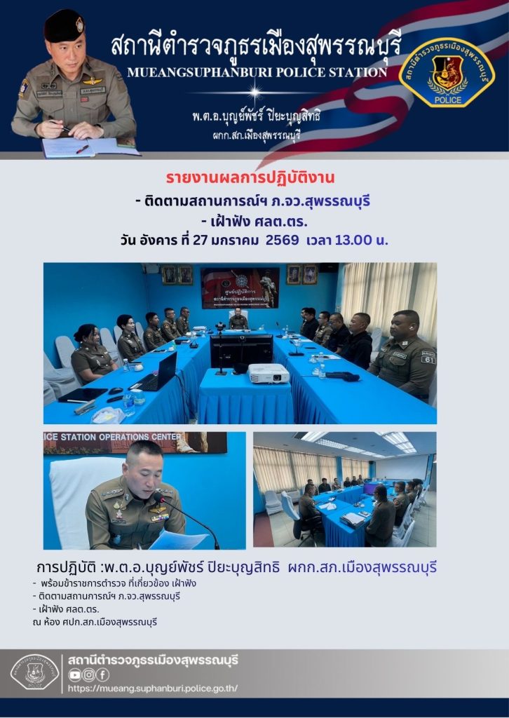 ประชุมติดตามสถานการณ์ฯ ภ.จว.สุพรรณบุรี 27 มกราคม 2569 โดย adm_suphan adm_suphan / ข่าวประชาสัมพันธ์,ข่าวกิจกรรมหัวหน้าสถานีตำรวจในการเสริมสร้างคุณธรรมและความโปร่งใส,ข่าวประชาสัมพันธ์,ข่าวภารกิจผู้บังคับบัญชา