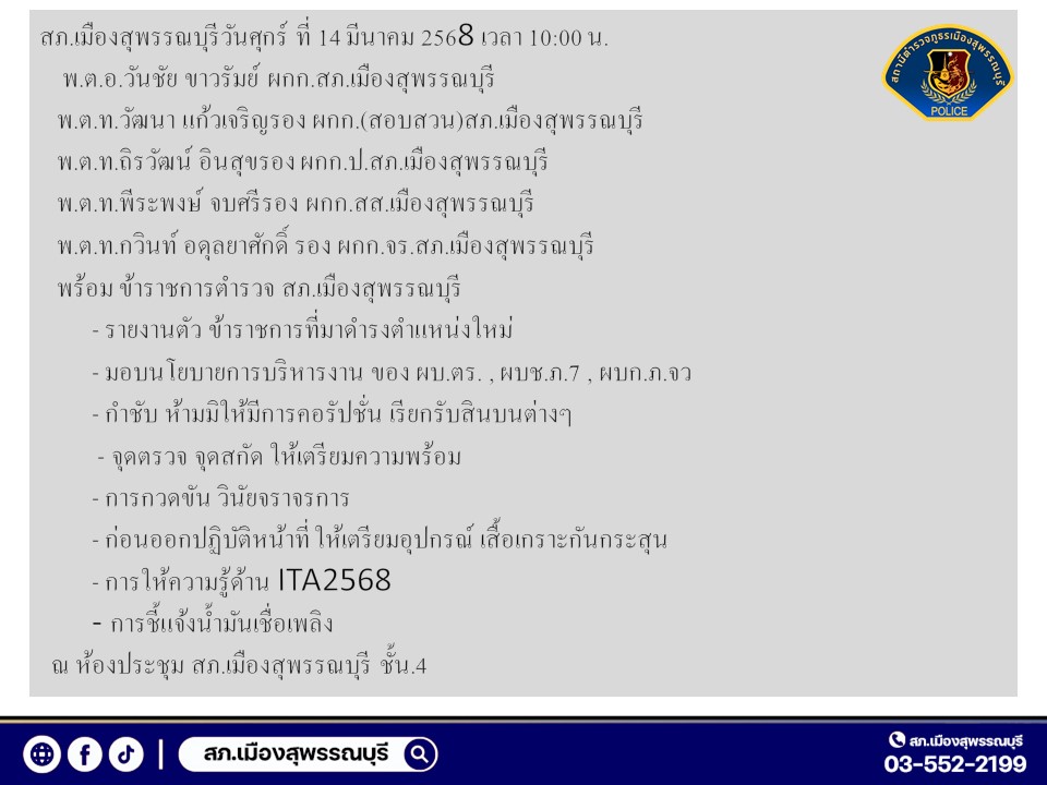 ประชุมมอบนโยบาย พ.ต.อ.วันชัย ขาวรัมย์ ผกก.สภ.เมืองสุพรรณบุรี