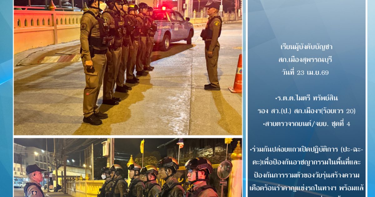 ปล่อยแถวเปิดปฏิบัติการ (ปะ-ฉะ-ดะ) 24 เมษายน 2569 โดย adm_suphan adm_suphan / ข่าวภารกิจผู้บังคับบัญชา,งานป้องกันปราบ สภ.เมืองสุพรรณบุรี สภ.เมืองสุพรรณบุรี วันที่ 23 เม.ย.69 ร.ต.ต.ไมตรี ทรัพย์สิน รอง สว.(ป.) สภ.เมืองฯ(ร้อยเวร 20) สายตรวจรถยนต์/จยย. ชุดที่ 4 ร่วมกันปล่อยแถวเปิดปฏิบัติการ (ปะ-ฉะ-ดะ)เพื่อป้องกันอาชญากรรมในพื้นที่และป้องกันการรวมตัวของวัยรุ่นสร้างความเดือดร้อนรำคาญแข่งรถในทางฯ พร้อมแล้วออกปฎิบัติหน้าที่เวลานี้