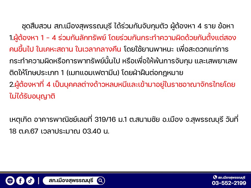 สส.2-ต.ค.67ชุดสืบสวน สภ.เมืองสุพรรณบุรี ได้ร่วมกันจับกุมตัว ผู้ต้องหา 4 ราย ข้อหา 1.ผู้ต้องหา 1 – 4 ร่วมกันลักทรัพย์