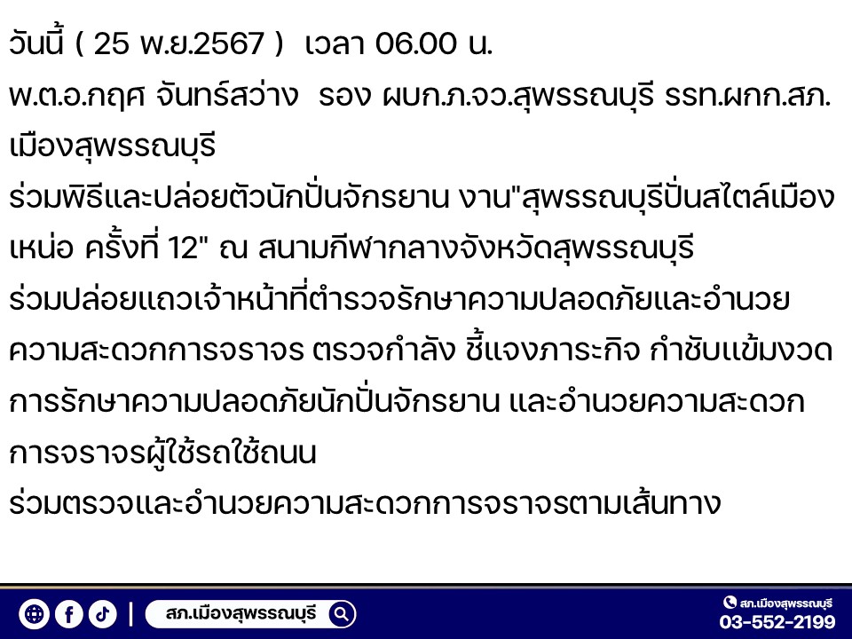 สุพรรณปั่นเมืองเหน่อ ครั้งที่ 12 25 พฤศจิกายน 2567 โดย adm_suphan adm_suphan / ข่าวประชาสัมพันธ์,ข่าวประชาสัมพันธ์,ข่าวฝากประชาสัมพันธ์,ข่าวภารกิจผู้บังคับบัญชา,งานจราจร สภ.เมืองสุพรรณบุรี,ข่าวภารกิจผู้บังคับบัญชา,งานป้องกันปราบ สภ.เมืองสุพรรณบุรี,ข่าวภารกิจผู้บังคับบัญชา,งานสอบสวน สภ.เมืองสุพรรณบุรี,ข่าวภารกิจผู้บังคับบัญชา,งานสืบสวน สภ.เมืองสุพรรณบุรี,ข่าวภารกิจผู้บังคับบัญชา,งานอำนวยการ สภ.เมืองสุพรรณบุรี